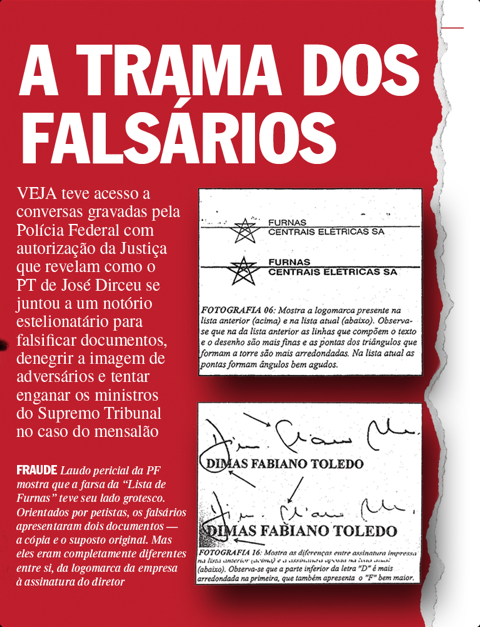 A Veja publica trechos de uma escuta telefônica realizada com autorização judicial para concluir que o PT de Minas Gerais tinha se unido a uma quadrilha de falsificadores para destruir Aécio Neves e seus aliados, no caso da Lista de Furnas.